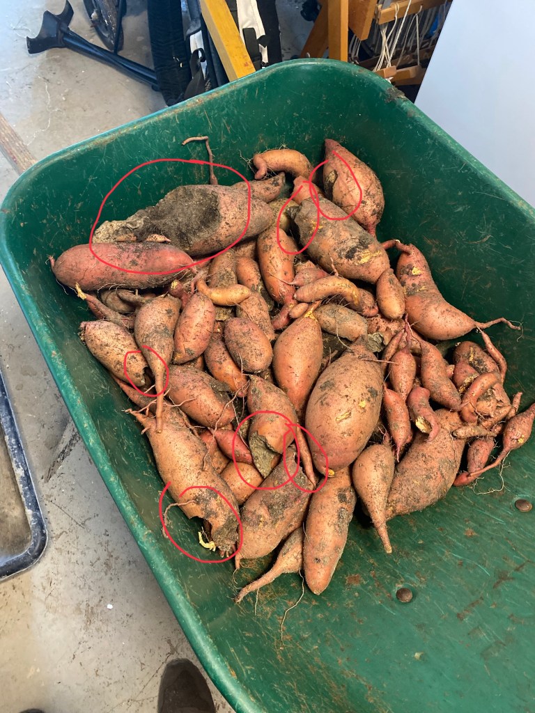 Similar to other potatoes, you harvest sweet potatoes when the leaves start to yellow. This is a sign that the chlorophyll is being sucked (my word, not the plant expert term) back into the root to hold for the following season of growth. You cannot eat green potatoes. It can make you really sick, so we don’t want the sucking of chlorophyll to happen. My plants had not started yellowing, but we had a couple of early frosts here in the piedmont of NC and the vines all wilted. Root tubers don’t like this, so it was time to dig up the harvest.