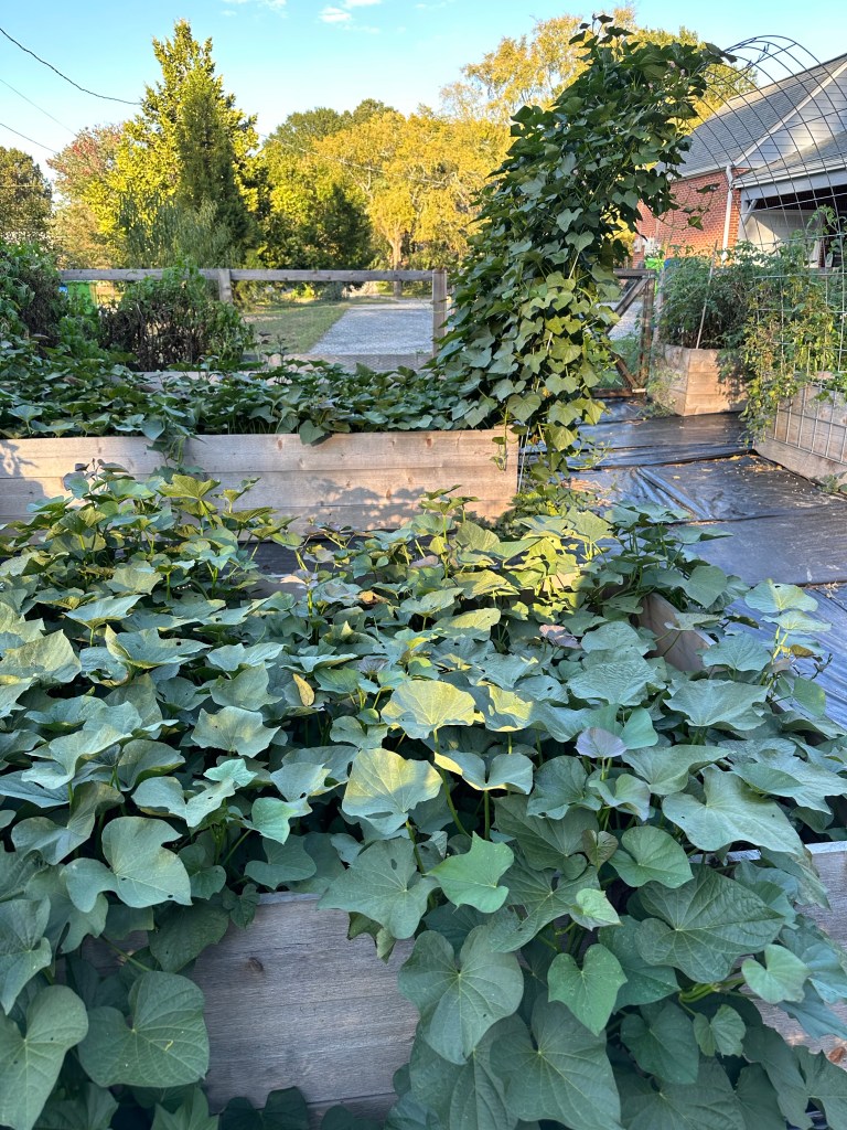 First of all, did you know that sweet potatoes grow up to 20 ft vines? Also, that’s not one spindly vine per plant. That’s many many vines per plant. It looked something like this.