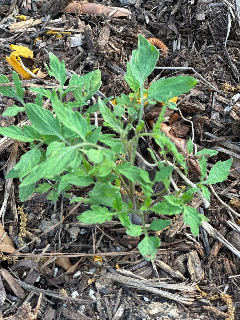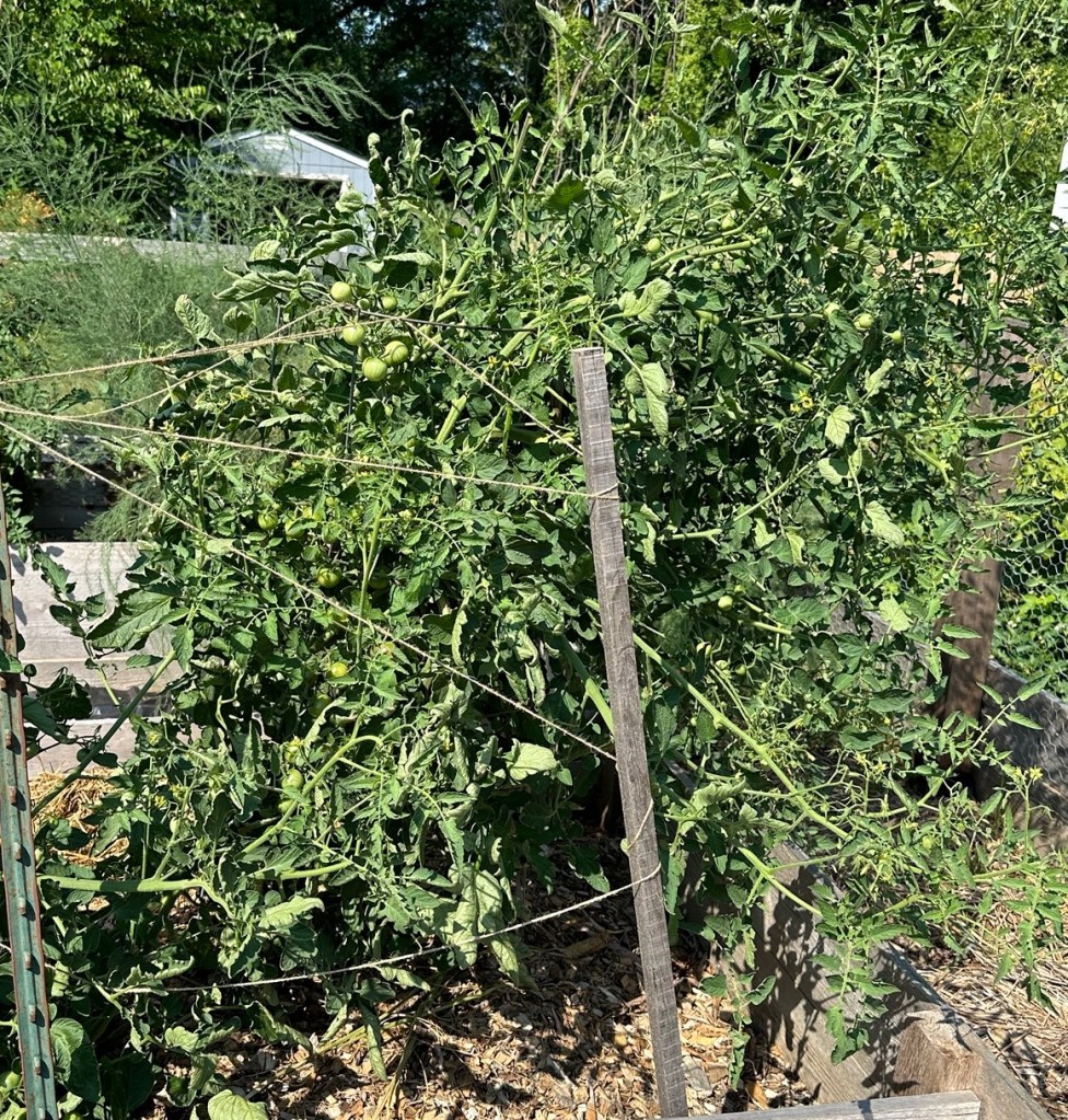 Fast forward to July. The plants are huge and producing many tomatoes. Then they start to turn red. But the tomatoes are all very small. Was this a consequence of all the heat and no rain that was June this year? Nope. Turns out that the tomatoes I wanted to reseed themselves were engineered to be sterile, so that you couldn’t save seeds. These volunteer tomato plants were the cherry tomatoes that no one would eat because they didn’t stay firm more than a day. Well, that’s not true. Someone did eat them. The birds. The birds ate them and shat them into the garden, the little buggers. All of my volunteers were cherry tomatoes. So, I removed two and ran to our local garden center to see if there were any larger tomato babies left.